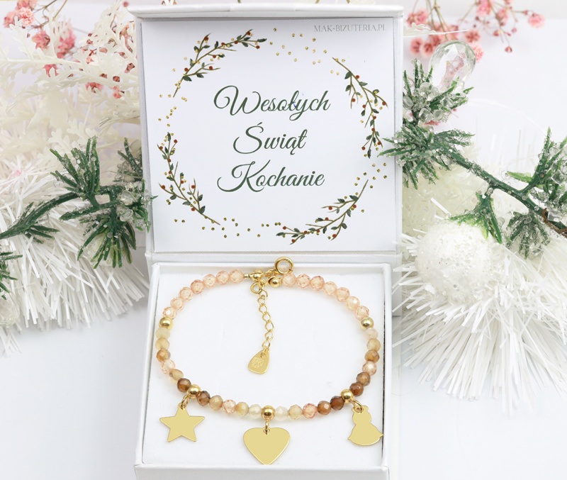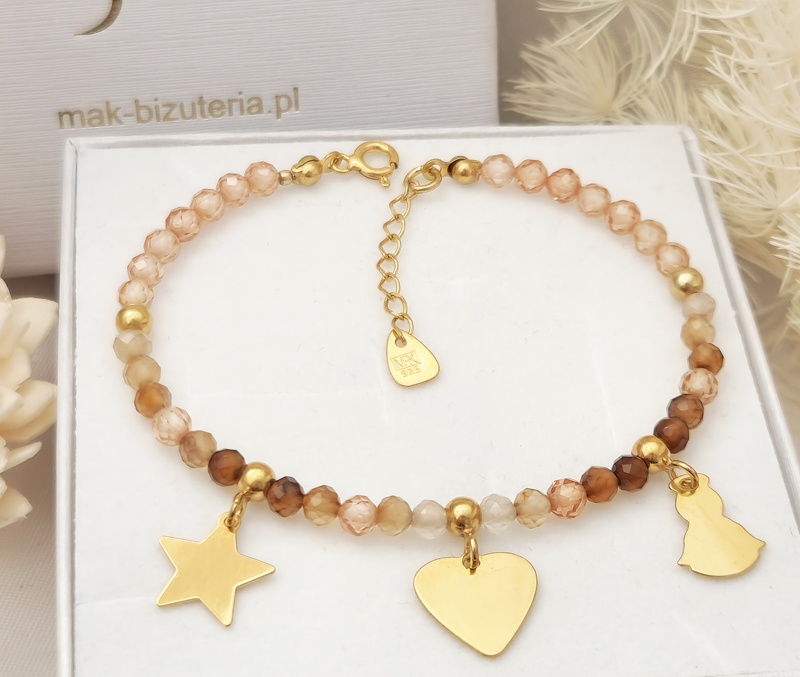 1734/5 beżowa bransoletka srebrna 925 z grawerem i kamieniami naturalnymi