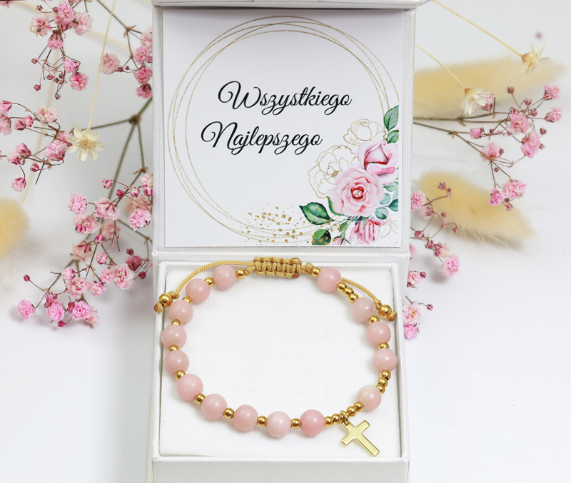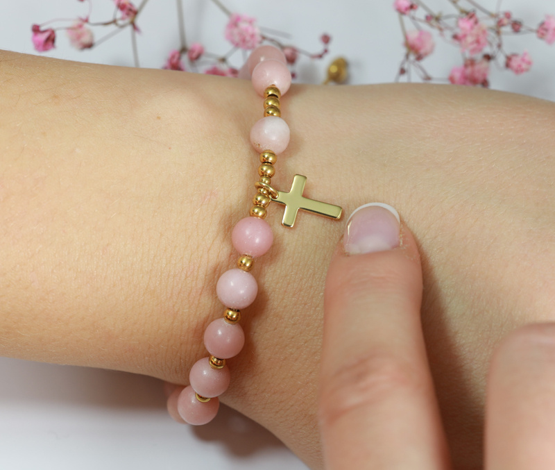 Bransoletka z różowymi kamieniami naturalnymi i zawieszką w kształcie krzyżyka to wyjątkowy dodatek dla osób ceniących sobie prostotę i symbolikę. Jest to biżuteria, która łączy w sobie delikatność, elegancję i duchowość. Idealna zarówno na co dzień, jak i na specjalne okazje.