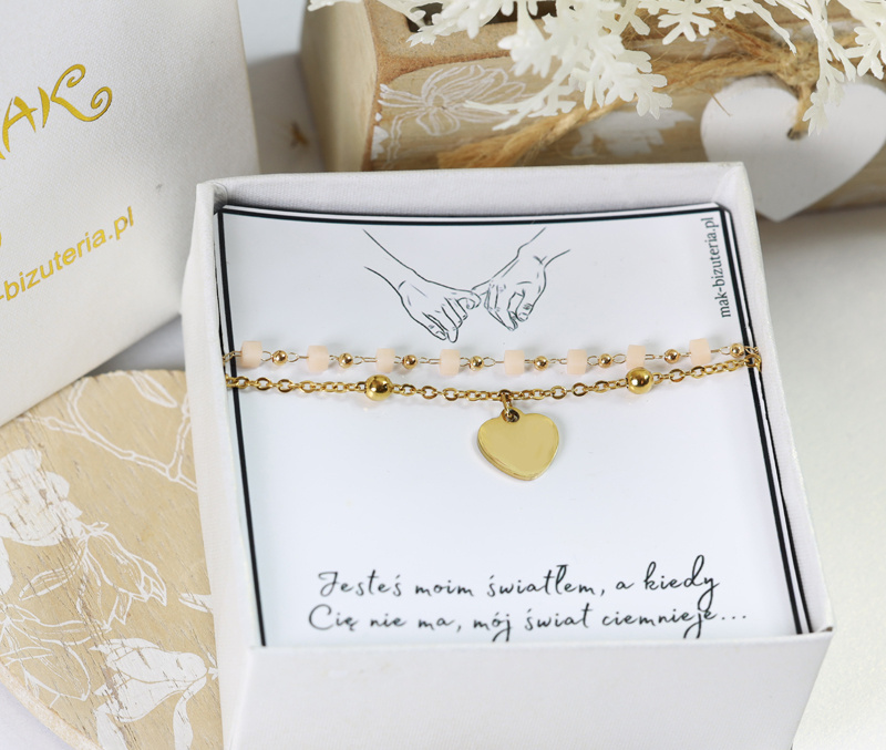 Bransoletka wykonana z szklanych kosteczek w pastelowym różu co w połączeniu z pozłacana stalą nierdzewną daje piękny kontrast. Bransoletka świetnie nada się na co dzień oraz na inne okazje. Dzięki regulacji dopasuje się do każdego nadgarstka.