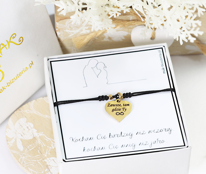 Przedmiotem oferty jest pozłacana bransoletka na sznurku z sercem zapakowana w eleganckie pudełko z kolorową etykietą z cytatem.
