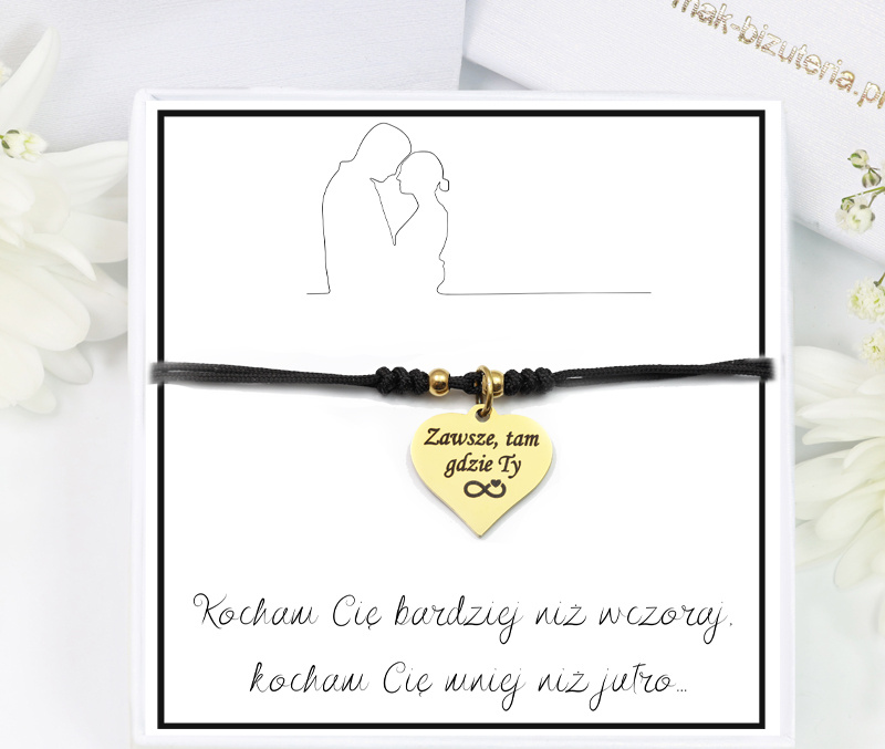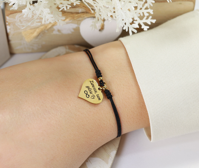 1701/4 bransoletka z sercem grawerowana złota dla dziewczyny na sznureczku