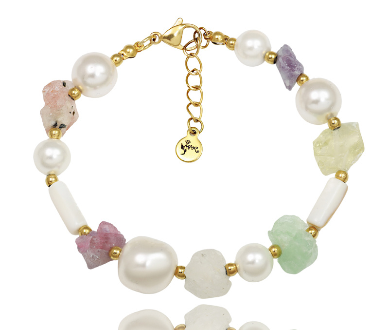 Przedmiotem oferty jest bransoletka wykonana z naturalnych kamieni oraz perełek, które w połączeniu z delikatnymi, złotymi elementami tworzą elegancką całość. Wyróżniają ją nieregularne kształty kamieni, które nadają jej unikalności i naturalnego charakteru. Dzięki przedłużającemu łańcuszkowi z zapięciem, bransoletkę można łatwo dopasować do nadgarstka.