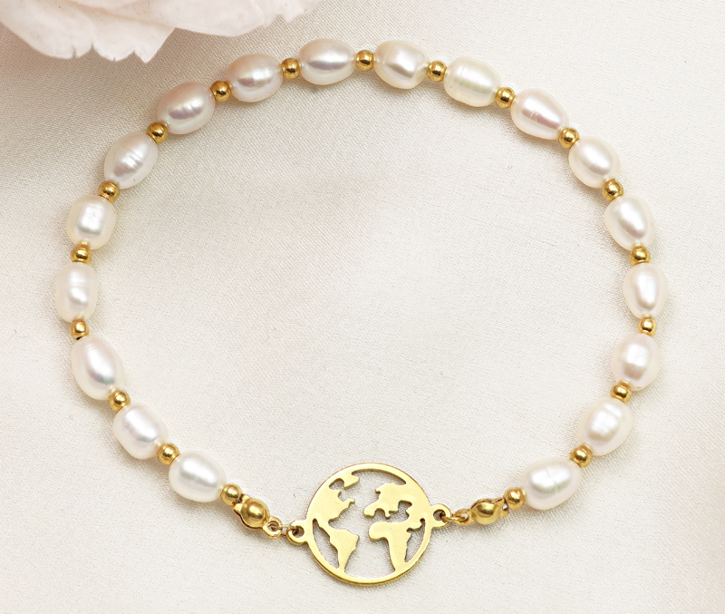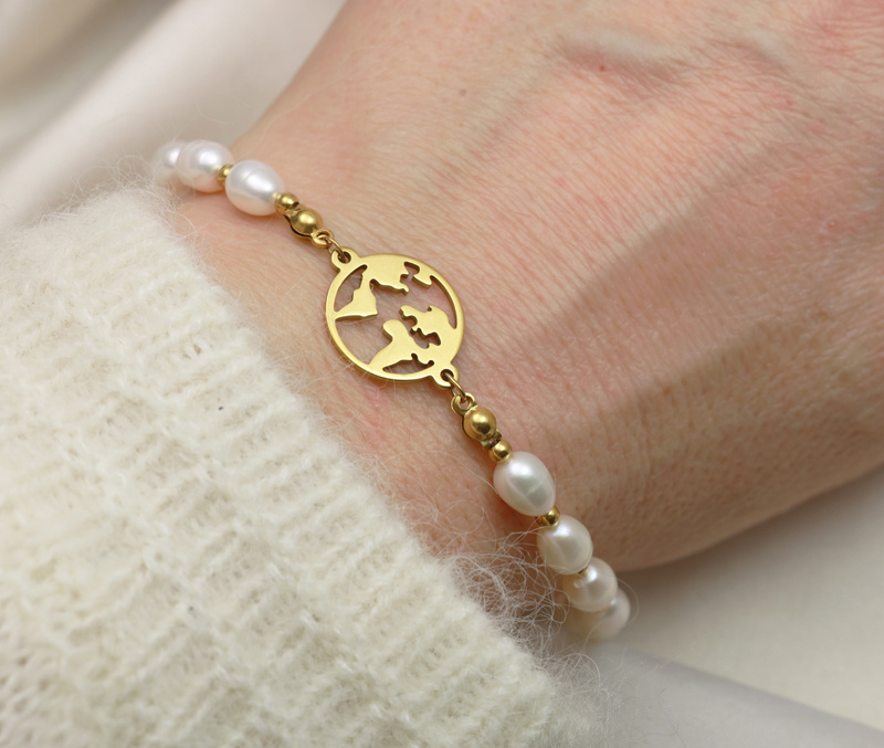 Przedmiotem oferty jest bransoletka pozłacana z perłami naturalnymi oraz globusem. Ponadczasowa kompozycja pereł będzie sprawiała, że bransoletka stanie się klasycznym dodatkiem, zarówno na co dzień jak i od święta.