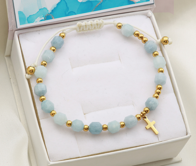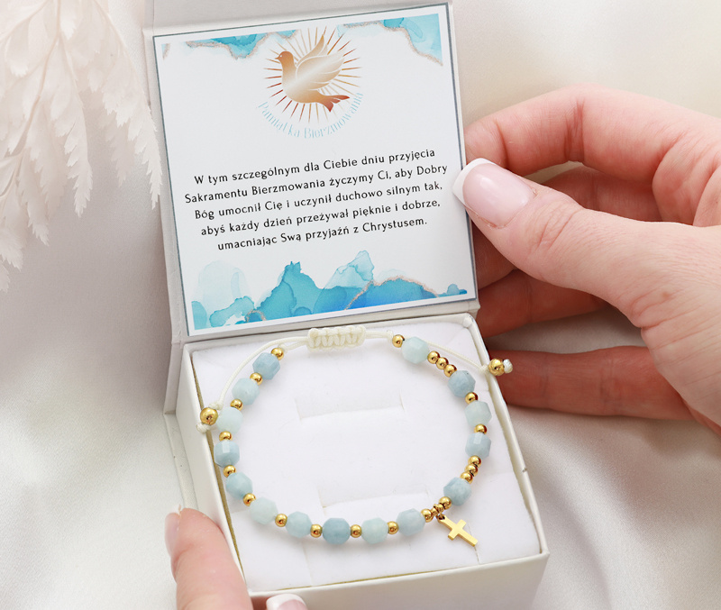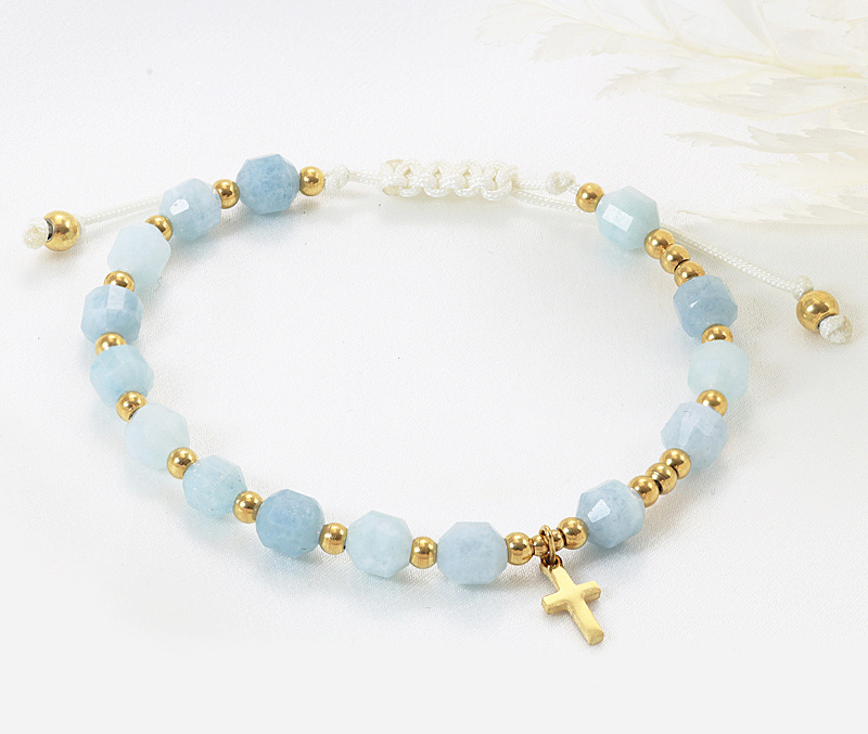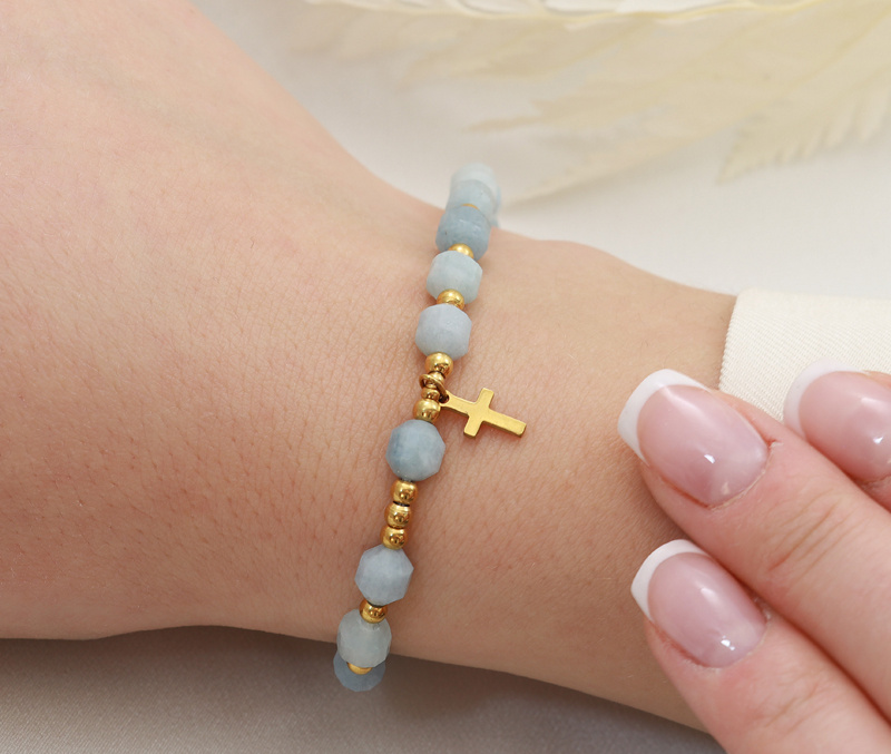 Delikatna i stylowa bransoletka wykonana z wysokiej jakości naturalnych kamieni: akwamarynu. Elementy bransoletki zostały wzbogacone o pozłacane kuleczki oraz krzyżyk.