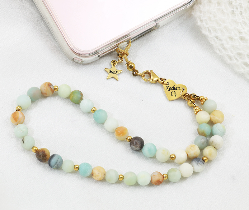 Smyczka do telefonu z grawerem 1761/4, kamienie naturalne miętowe amazonit
