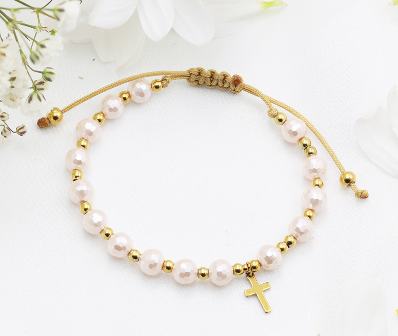 Delikatna i stylowa bransoletka wykonana z wysokiej jakości szklanych pereł. Elementy bransoletki zostały wzbogacone o pozłacane kuleczki oraz krzyżyk.