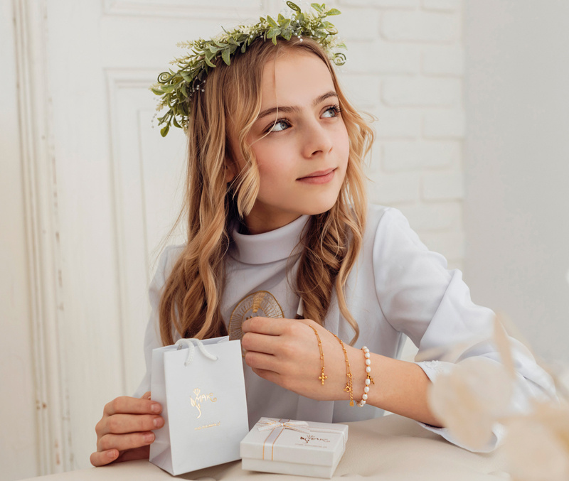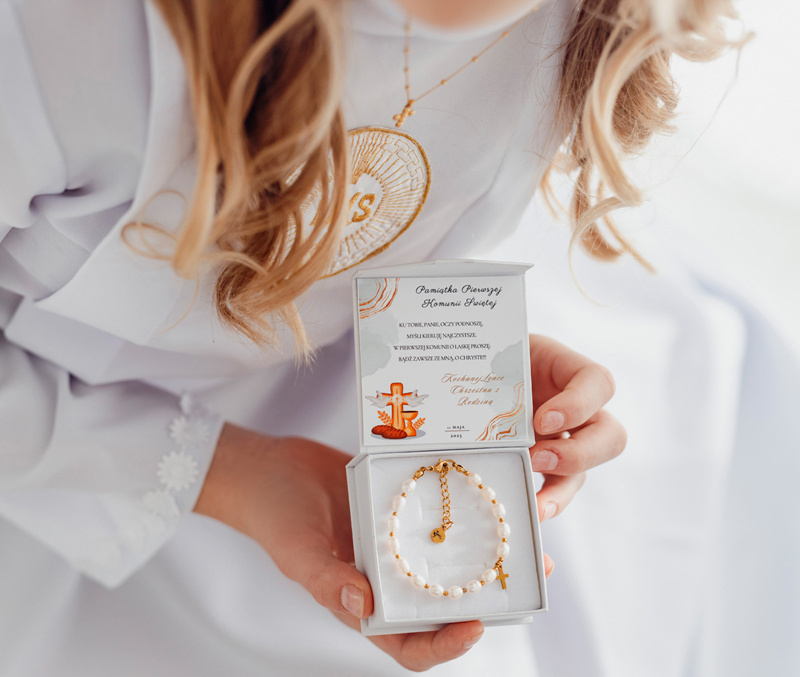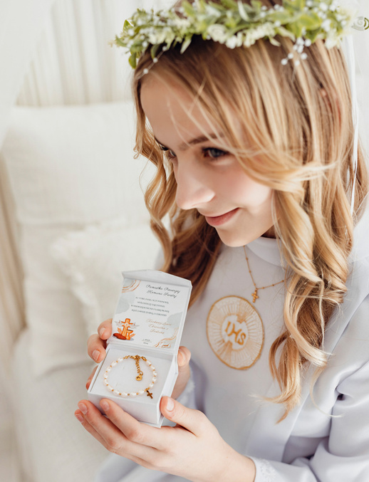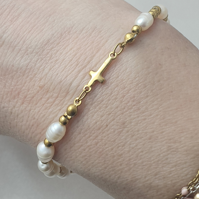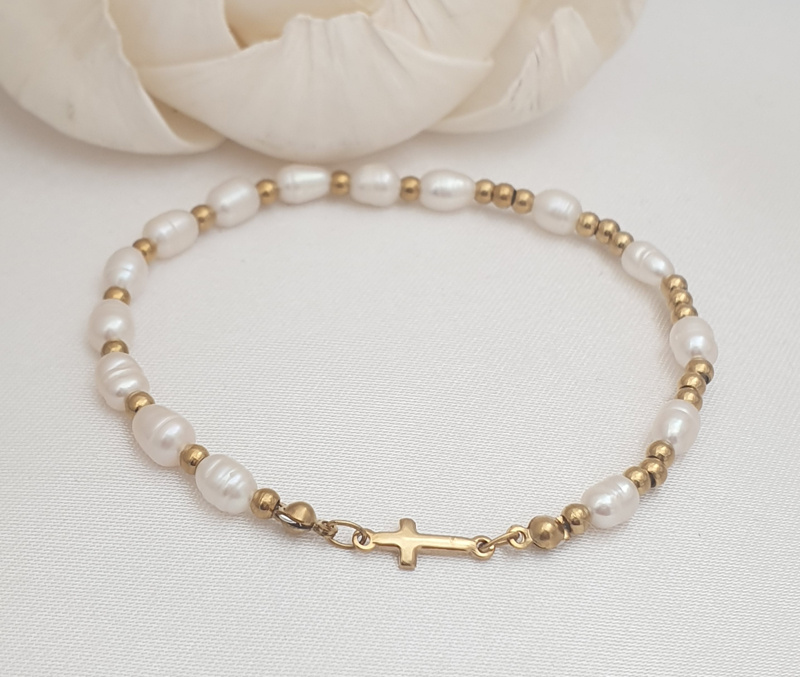 Przedmiotem oferty jest bransoletka różaniec dziewczęca z perełkami naturalnymi, wykonana ze stali szlachetnej pokrytej 24 karatowym złotem .