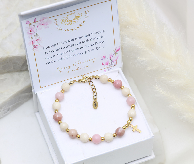 Elegancka bransoletka różaniec to idealny wybór dla osób poszukujących wyjątkowego prezentu dla siebie lub bliskiej osoby, który reprezentuje wartości chrześcijańskie. Piękny różaniec może być świetnym prezentem na Pierwszą Komunię Świętą czy Bierzmowanie. W połączeniu z eleganckim pudełkiem z dedykacją stworzy niezapomniany upominek.