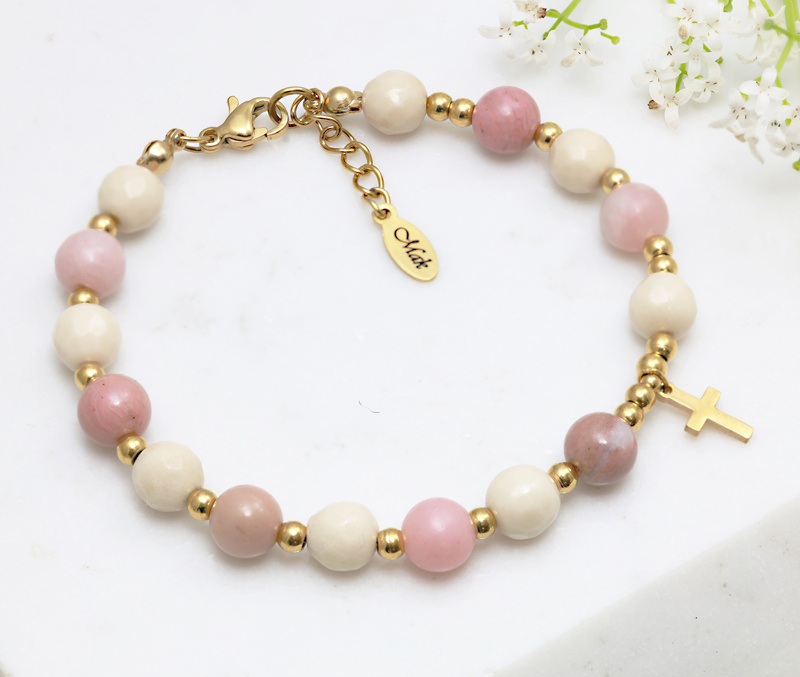 Delikatna i stylowa bransoletka wykonana z kamieni naturalnych. Elementy bransoletki zostały wzbogacone o pozłacane kuleczki oraz krzyżyk.