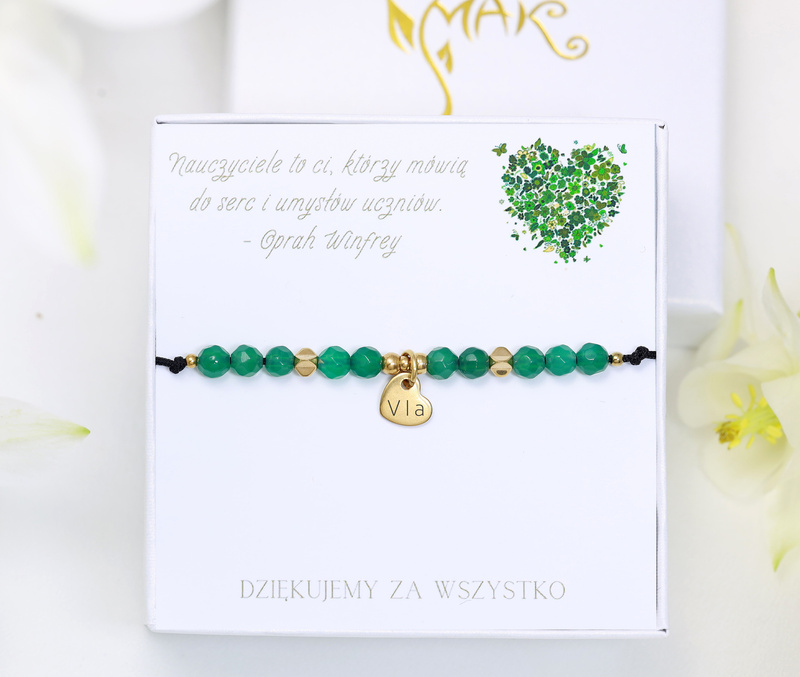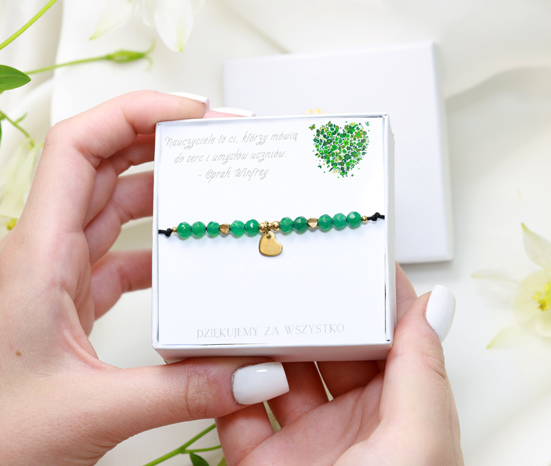 Zestaw prezentowy dla nauczyciela, który doskonale oddaje wdzięczność i uznanie. Składa się z delikatnej bransoletki wykonanej z zielonych agatów i złotych elementów w tym serduszka na którym można zamieścić grawerunek. Dopełnieniem jest piękne opakowanie z motywującym cytatem. Idealny wybór na podziękowanie nauczycielowi za trud, zaangażowanie i serce włożone w edukację. Bransoletka stworzona z kamieni naturalnych w odcieniach zieleni, wraz ze złotymi dodatkami tworzą elegancką kompozycję. Bransoletka to nie tylko piękna biżuteria, ale też sentymentalny upominek, który będzie przypominać o klasie. Taki gest z pewnością będzie doceniony przez nauczyciela.