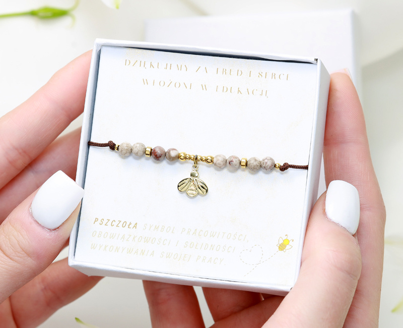 Zestaw prezentowy dla nauczyciela, który doskonale oddaje wdzięczność i uznanie. Składa się z delikatnej bransoletki wykonanej beżowo-brązowych kamieni naturalnych i złotej pszczółki. Dopełnieniem jest piękne opakowanie z motywującym cytatem. Idealny wybór na podziękowanie nauczycielowi za trud, zaangażowanie i serce włożone w edukację. Bransoletka to nie tylko piękna biżuteria, ale też sentymentalny upominek, który będzie przypominać o klasie. Taki gest z pewnością będzie doceniony przez nauczyciela.
