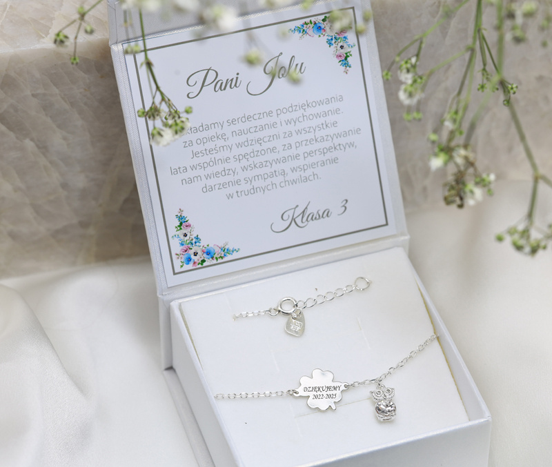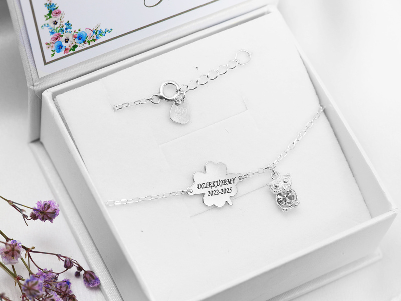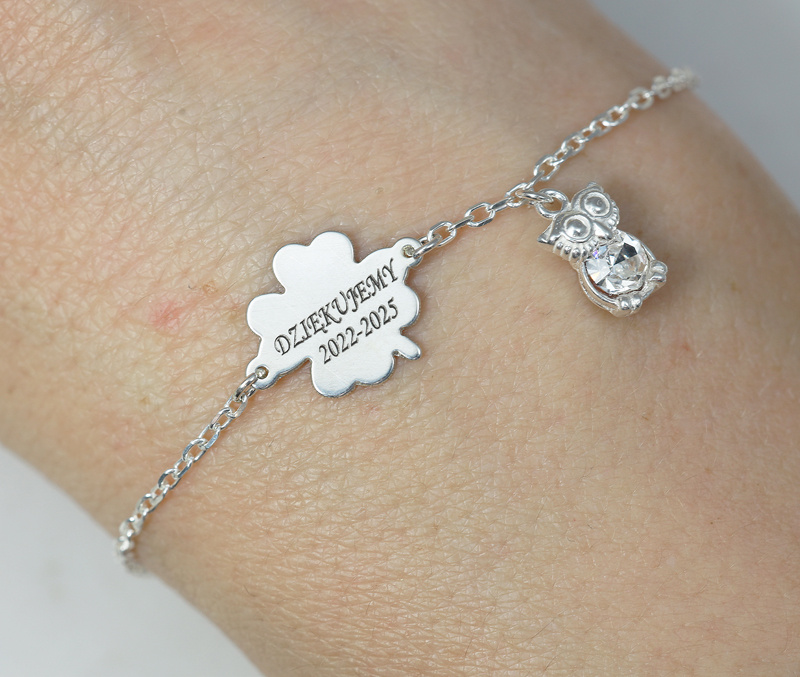 Bransoletka srebrna 925 z serduszkiem pod grawerunek oraz z sówką. Jeżeli chcesz w wyjątkowy sposób podziękować swojej kochanej pani nauczycielce, ta bransoletka dobrze się sprawdzi.