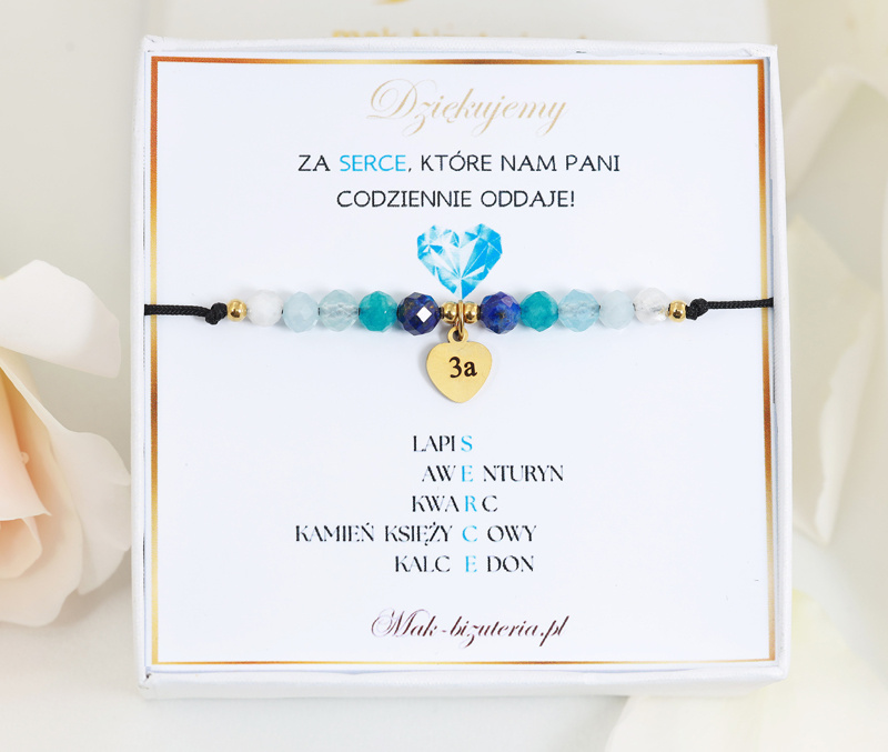 Zestaw prezentowy dla nauczyciela, który doskonale oddaje wdzięczność i uznanie. Składa się z delikatnej bransoletki wykonanej niebieskich kamieni naturalnych i złotych elementów. Dopełnieniem jest piękne opakowanie z motywującym cytatem. Idealny wybór na podziękowanie nauczycielowi za trud, zaangażowanie i serce włożone w edukację.