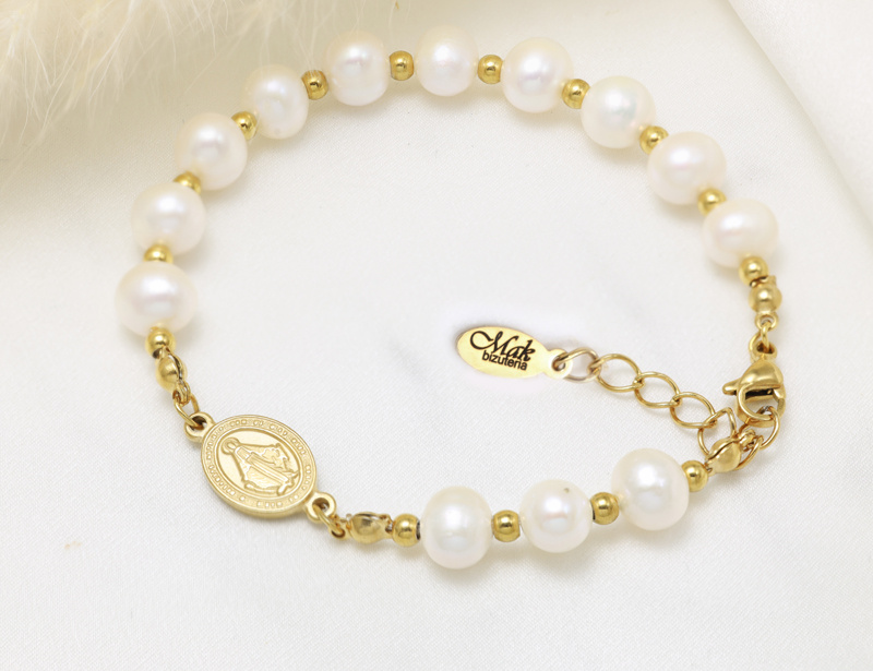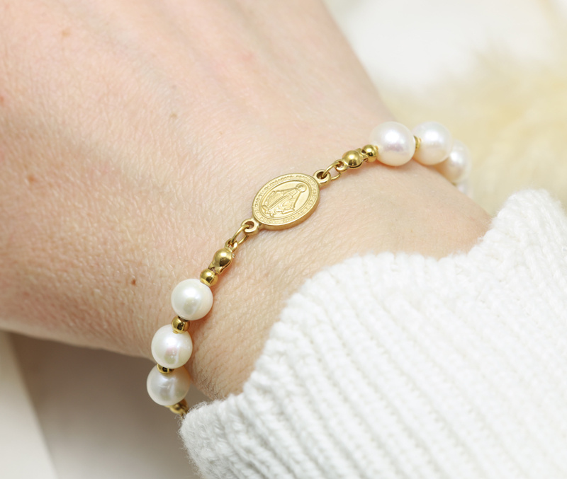 Przedmiotem oferty jest bransoletka różaniec dziewczęca z perełkami naturalnymi, wykonana ze stali szlachetnej pokrytej 24 karatowym złotem .