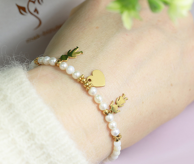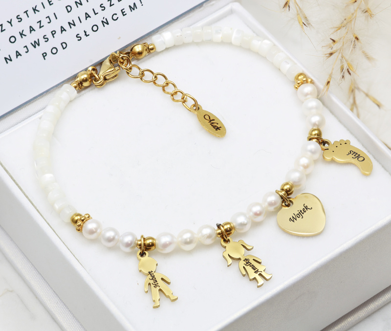 Wyjątkowa bransoletka wykonana z perełek, masy perłowej oraz złotych elementów ze stali szlachetnej, ozdobiona czterema personalizowanymi zawieszkami o rożnych kształtach do wyboru: