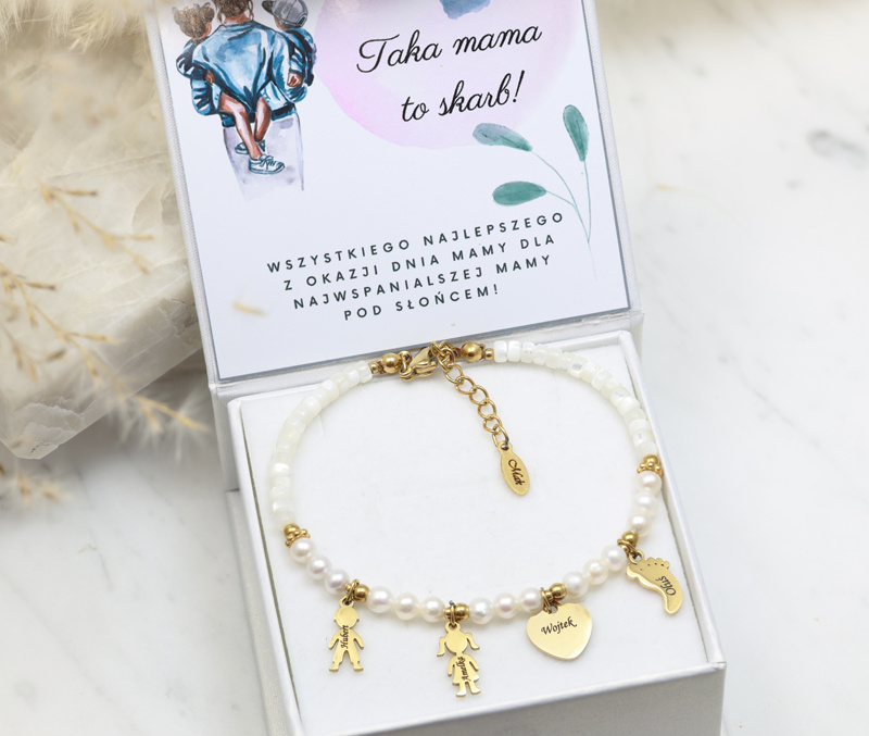 Możliwość wygrawerowania imion dzieci czyni tę bransoletkę idealnym prezentem na Dzień Mamy, urodziny, czy po prostu – z miłości.