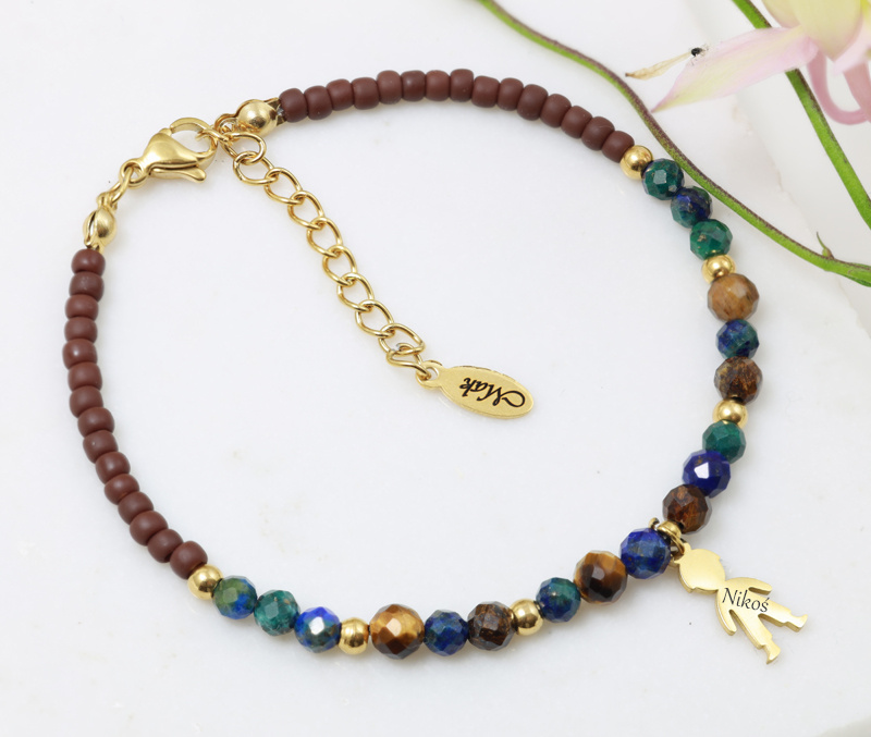 Delikatna i stylowa bransoletka wykonana z połączenia matowych brązowych szklanych koralików oraz fasetowanych kamieni naturalnych - tygrysiego oka i lapisu phonix w odcieniach zieleni, niebieskiego i brązu. Zdobiona subtelnymi, złotymi przekładkami oraz zawieszką w kształcie dziecka – idealną jako symbol miłości, bliskości lub prezent dla mamy. Bransoletka posiada eleganckie, złocone zapięcie typu karabińczyk oraz regulowany łańcuszek zakończony blaszką z grawerem "Chat", co nadaje jej wyjątkowego, spersonalizowanego charakteru.