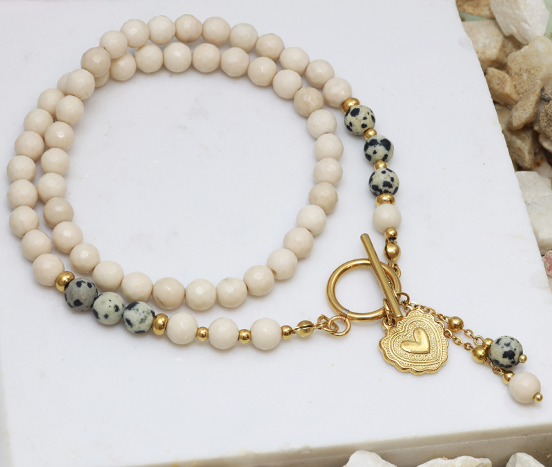 Naszyjnik wykonany z pięknych, naturalnych kamieni w odcieniach kremowym i beżowym, przeplatanych drobnymi, ozdobnymi elementami. Centralnym punktem jest złota zawieszka w kształcie serca oraz małe, podwieszane kulki z kamienia, które nadają biżuterii wyjątkowego uroku. Zapięcie typu toggle nie tylko ułatwia zakładanie, ale stanowi stylowy detal ozdobny.