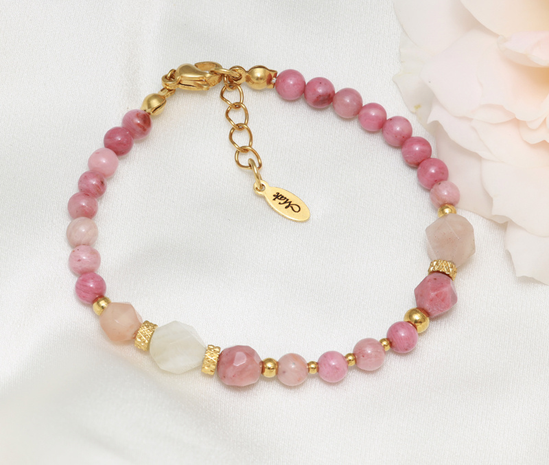 Delikatna i urocza bransoletka z naturalnych, różowych kamieni. Idealnie układa się na nadgarstku, dodając subtelnego blasku. To uniwersalny dodatek, który świetnie sprawdzi się zarówno noszony solo, jak i w zestawie z inną biżuterią.