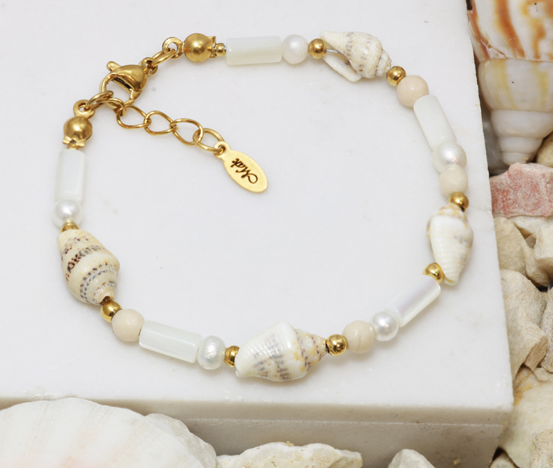 Ta ręcznie wykonana bransoletka to kwintesencja letniego stylu. Połączenie bieli, złota i delikatnych kształtów sprawia, że jest lekka, kobieca i niezwykle stylowa. Idealnie wygląda w duecie, ale także pięknie prezentuje się osobno.