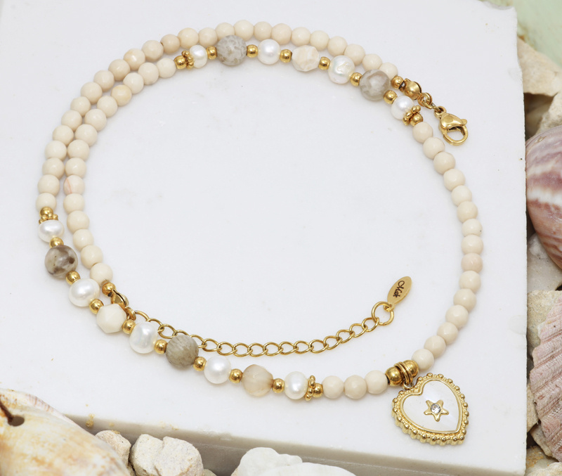 Zjawiskowy naszyjnik, który łączy w sobie naturalne piękno kamieni i pereł z romantycznym akcentem w postaci złoconej zawieszki w kształcie serca. Starannie dobrane kremowe i beżowe odcienie naturalnych kamieni tworzą harmonijną kompozycję, która pięknie podkreśli dekolt.