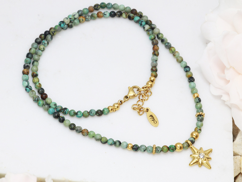 Delikatny naszyjnik wykonany z drobnych koralików afrykańskiego turkusu, wykończony złotymi akcentami i zawieszką w kształcie gwiazdy z cyrkonią. Naturalna kolorystyka kamieni pięknie komponuje się z pozłacaną stalą, tworząc wyjątkowy, lekko boho klimat.