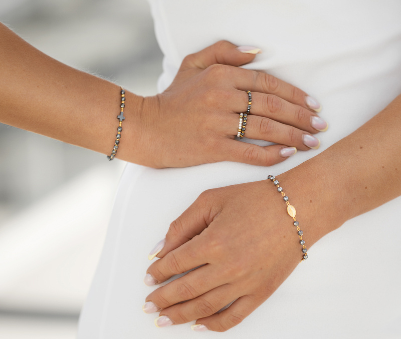 Bransoletkę zdobi hematytowy krzyżyk, który nadaje jej charakter różańca – idealny wybór dla osób ceniących duchowe akcenty w biżuterii. Całość uzupełniają pozłacane elementy ze stali szlachetnej, odporne na ścieranie i przebarwienia, które podkreślają luksusowy charakter dodatku.