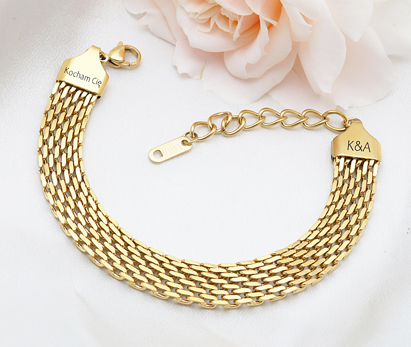 Stylowa i wyrazista bransoletka, która doskonale łączy klasykę z osobistym przekazem. Wykonana z wysokiej jakości stali szlachetnej pokrytej złotą powłoką, przyciąga uwagę dzięki swojej szerokiej, plecionej strukturze i delikatnemu połyskowi. Twój grawer nada tej bransoletce wyjątkowy, osobisty charakter.
