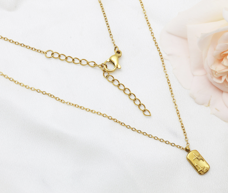 Naszyjnik wykonany z wysokiej jakości stali szlachetnej, pokrytej warstwą złota metodą PVD. Model wyposażony jest w regulowany łańcuszek typu ankier oraz zawieszkę w formie prostokątnej blaszki z gwiazdkami.