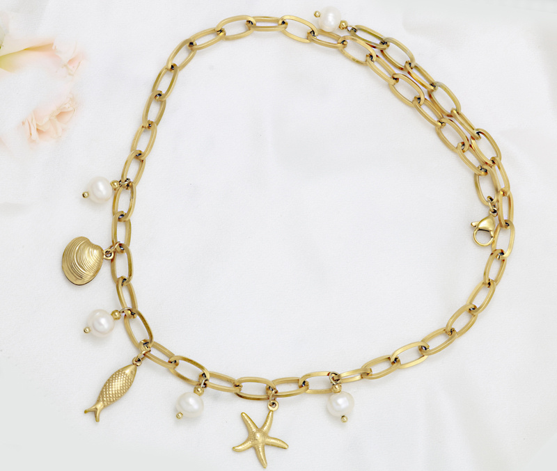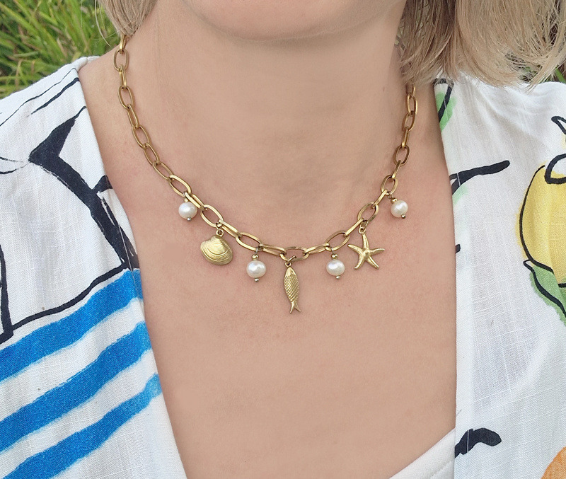 Letni klimat w każdym detalu – złoty naszyjnik ozdobiony zawieszkami w kształcie muszelki, rybki, rozgwiazdy i delikatnych perełek idealnie wpisuje się w wakacyjny klimat. Doskonale uzupełni zarówno plażowe stylizacje, jak i wieczorne wyjścia.
