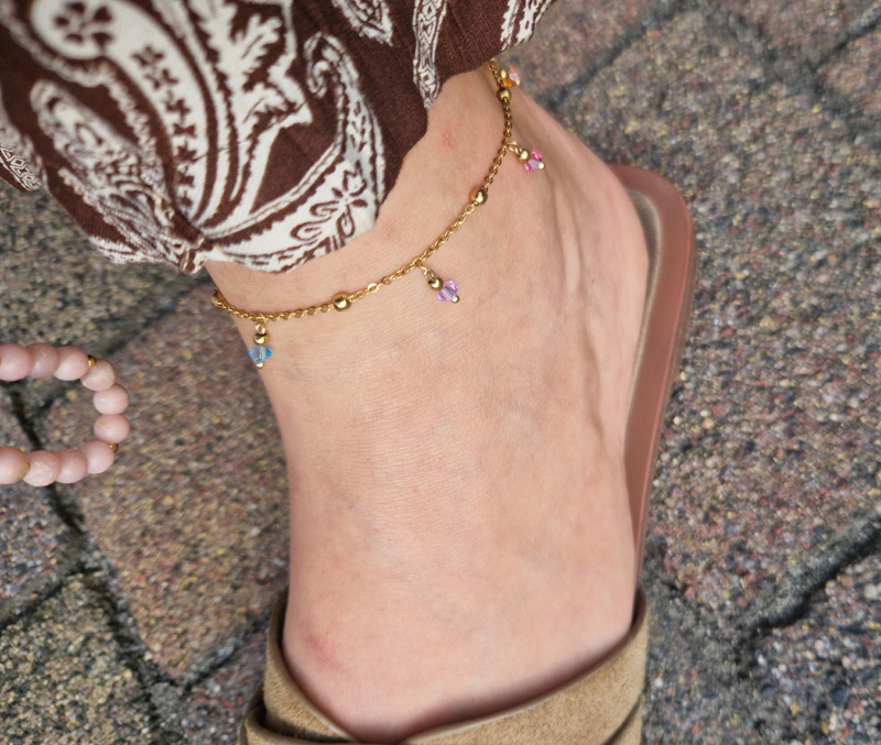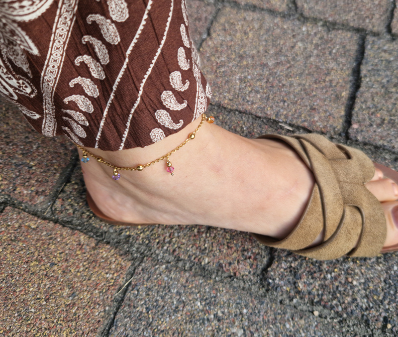 Ta bransoletka na nogę to elegancki i subtelny dodatek, który doskonale podkreśli letnie stylizacje. Wykonana jest ze złotego łańcuszka, na którym umieszczone są małe, błyszczące kulki oraz kolorowe kryształy Swarovski Elements. Posiada regulowane zapięcie, co pozwala na idealne dopasowanie. Bransoletka idealnie nadaje się do noszenia zarówno na plaży, jak i podczas wieczornych wyjść, dodając blasku każdej stylizacji. Jest lekka i wygodna, a jednocześnie trwała, co sprawia, że będzie cieszyć oko przez długi czas.
