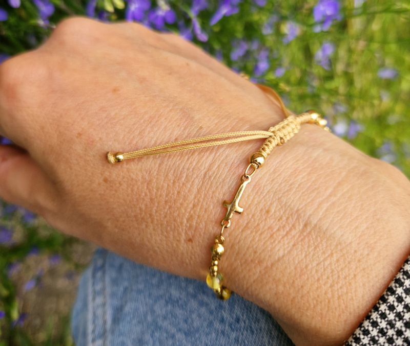 Bransoletka z bursztynami i krzyżykiem – złoto i sznurek