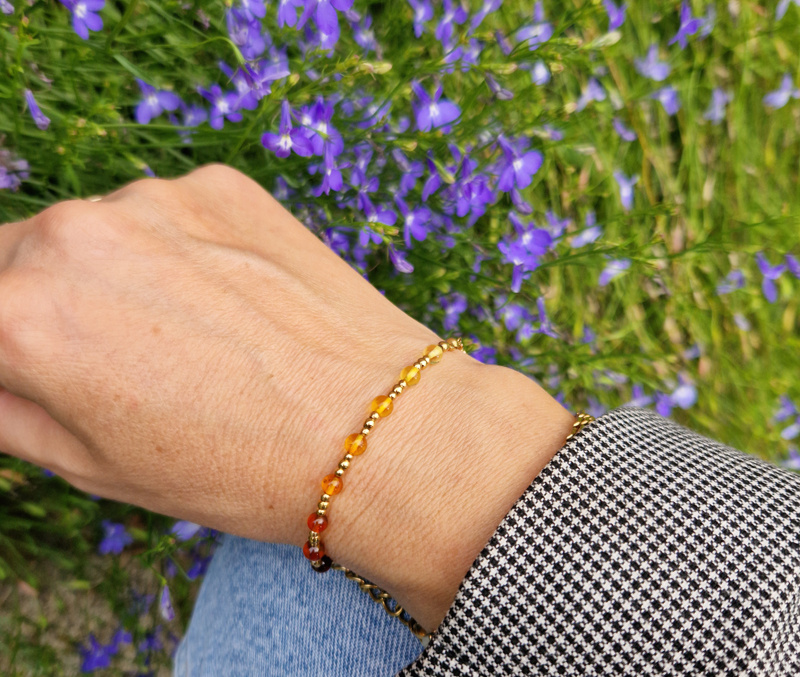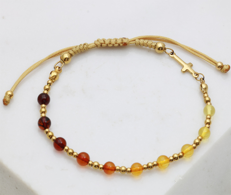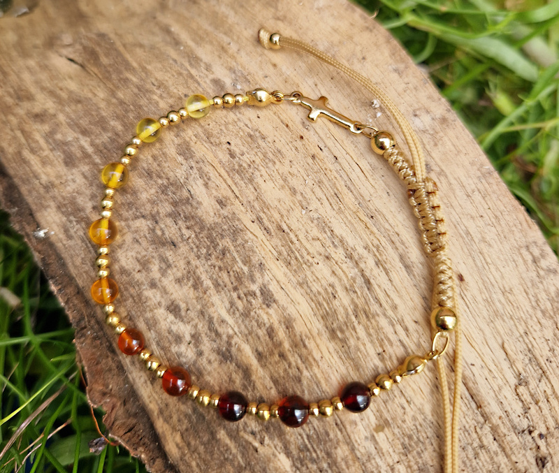 Dodaj odrobinę klasy i duchowego znaczenia do swojej biżuterii dzięki tej eleganckiej bransoletce z naturalnymi bursztynami. Model łączy w sobie ciepłe odcienie bursztynu – od głębokiego koniaku, przez miodowy, aż po jasny cytrynowy – z pozłacanymi koralikami i delikatnym złotym krzyżykiem. Wszystko to osadzone na regulowanym, kremowym sznurku, który gwarantuje wygodne dopasowanie do każdego nadgarstka.