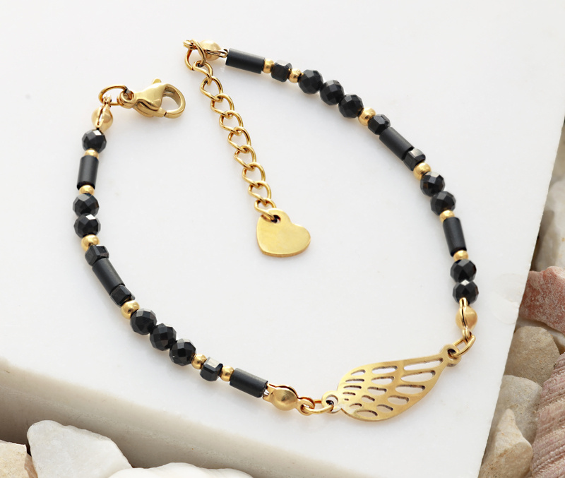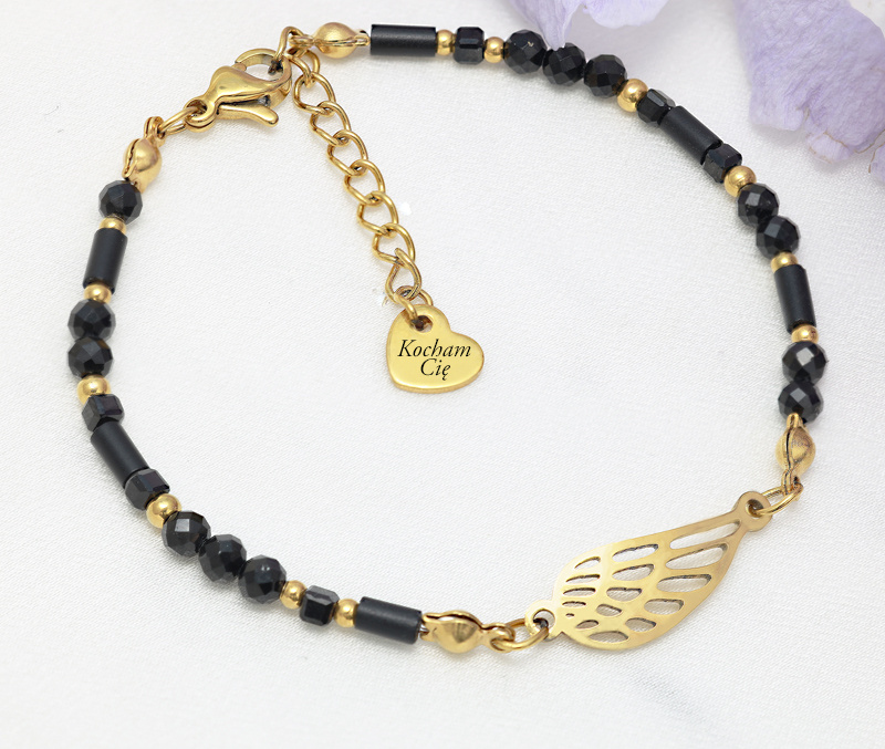 Bransoletka z subtelnym skrzydełkiem to elegancka biżuteria, która doda blasku każdej stylizacji. Wykonana z czarnych kamieni naturalnych w połączeniu ze złotymi detalami, tworzy wyjątkowy kontrast. Zawieszka w kształcie skrzydła oraz urocza złota zawieszka z napisem "Kocham Cię" stanowią piękne, osobiste akcenty. Dodatkowo z regulacją umożliwia dopasowanie bransoletki do nadgarstka. Idealna na prezent lub codzienne noszenie, dodaje klasy i wdzięku każdej kobiecie.