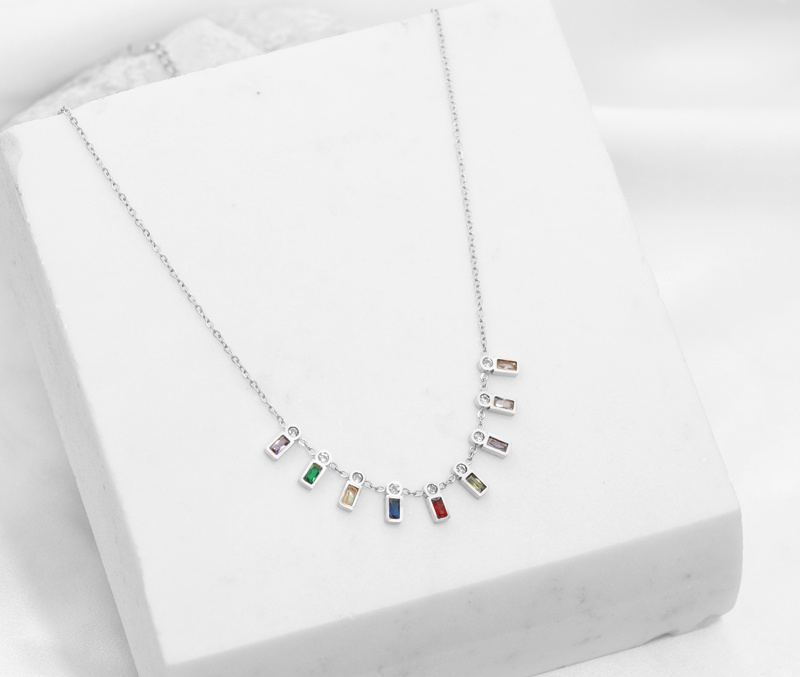 Delikatny naszyjnik w srebrnym kolorze, ozdobiony prostokątnymi cyrkoniami w różnych odcieniach, które subtelnie połyskują przy każdym ruchu. Klasyczna elegancja połączona z nutą nowoczesności sprawia, że jest to idealny dodatek zarówno na co dzień, jak i na wyjątkowe okazje.