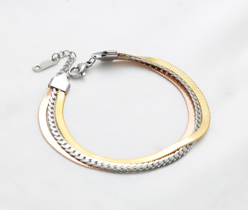 Nowoczesna bransoletka z potrójnych łańcuszków w trzech odcieniach: srebrnym, złotym oraz różowego złota. Delikatne sploty pięknie układają się na nadgarstku, tworząc efektowną całość. To wyjątkowa biżuteria, która łączy w sobie elegancję i uniwersalność, idealna na co dzień oraz na wyjątkowe okazje.