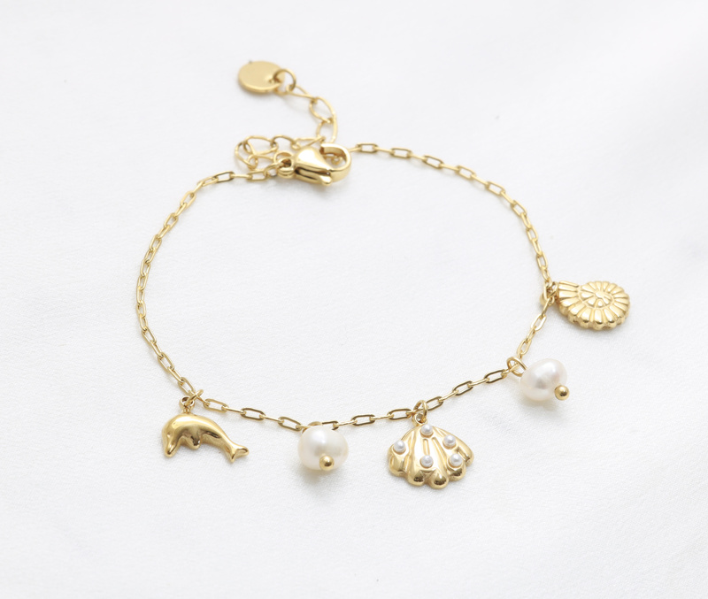 Urocza bransoletka wakacyjnymi klimatem. Zdobiona pięcioma zawieszkami: delikatnym delfinem, muszelką w kształcie ślimaka, dwiema błyszczącymi perłami oraz klasyczną muszelką. Całość tworzy subtelną i pełną wdzięku kompozycję, która doskonale podkreśli letnie stylizacje, a jednocześnie sprawdzi się także jako drobny akcent elegancji na co dzień.