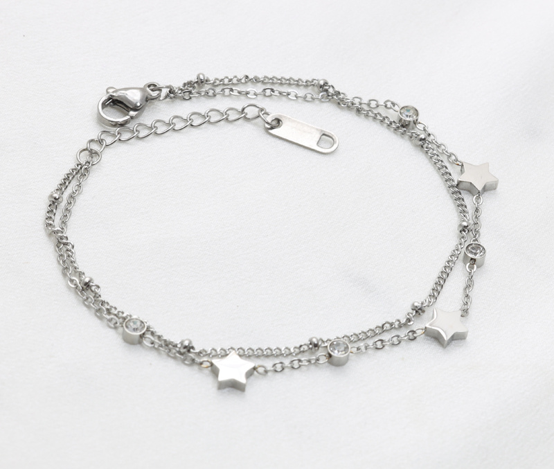 Subtelna bransoletka na podwójnym łańcuszku, która łączy w sobie delikatne kuleczki i błyszczące cyrkonie w okrągłej oprawie. Dodatkowo całość ozdobiona jest uroczymi gwiazdeczkami, co nadaje biżuterii wyjątkowego, kobiecego charakteru. Idealna na co dzień i do eleganckich stylizacji.