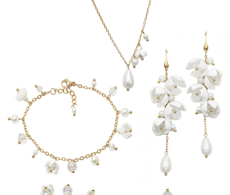 Asymetryczny naszyjnik z kwiatami i perłami to wyjątkowy wybór na ślub lub inne uroczystości. Delikatne białe kwiatuszki na złotej oprawie w połączeniu z subtelnymi perłami i kryształkami tworzą harmonijną całość, która doskonale uzupełni elegancką stylizację. Idealna biżuteria dla kobiet szukających czegoś ponadczasowego, z nutą nowoczesnej elegancji.