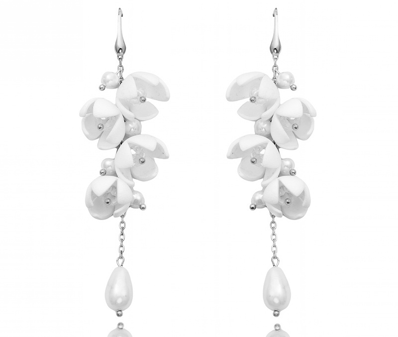 ręcznie robione kolczyki ślubne z kwiatami, kryształami i perłami srebro 925 1816/5