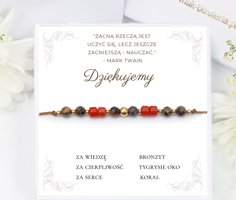 Wyjątkowa bransoletka, która w piękny sposób podkreśla wdzięczność i uznanie. Wykonana z naturalnych kamieni i złotych elementów, zamknięta w eleganckim opakowaniu z motywującym cytatem. Doskonały prezent na podziękowanie za trud, cierpliwość i serce włożone w edukację.