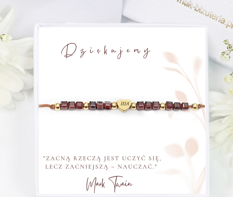 Elegancka bransoletka z zawieszką w kształcie serca, którą można spersonalizować grawerem, to wyjątkowy sposób na okazanie wdzięczności i uznania. Wykonana z naturalnych kamieni i złotych elementów, zapakowana w estetyczne pudełeczko z motywującym cytatem. Idealny prezent, by podziękować za trud, cierpliwość i serce włożone w edukację.