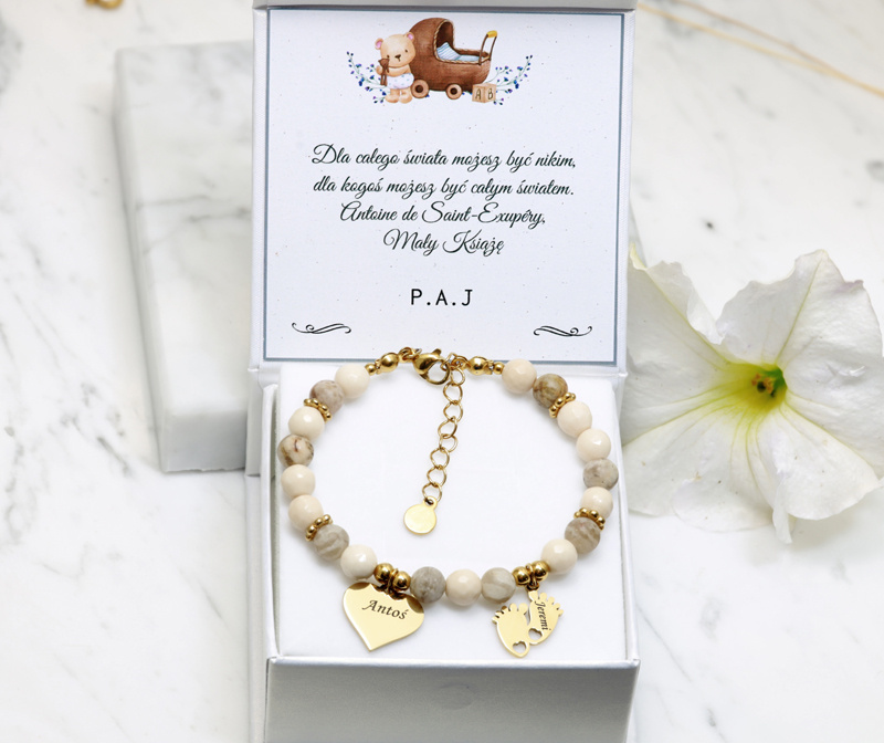 Bransoletka z kamieniami naturalnymi z możliwością personalizacji to wyjątkowy prezent dla mamy. Dzięki opcji indywidualnego dopasowania zawieszki oraz unikalnego graweru, możesz stworzyć biżuterię, która najlepiej oddaje charakter i emocje najważniejszych chwil – od baby shower, przez narodziny dziecka, aż po Dzień Mamy. Elegancki design, wysoka jakość wykonania i naturalne materiały sprawiają, że bransoletka ta stanie się nie tylko piękną ozdobą, ale i sentymentalną pamiątką na długie lata.