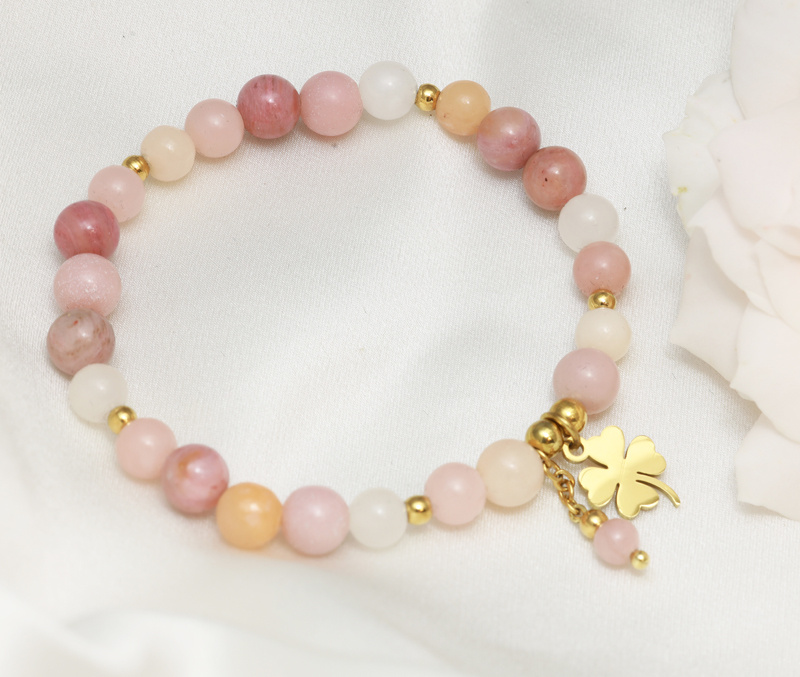 Bransoletka stworzona z naturalnych kamieni, utrzymana w różowej tonacji, przełamanej złotymi akcentami. Ozdobiona zawieszką w kształcie koniczynki oraz podwieszanym kamieniem, idealnie komponuje się z wieloma stylizacjami. Elastyczna gumka zapewnia komfort noszenia i łatwe zakładanie.