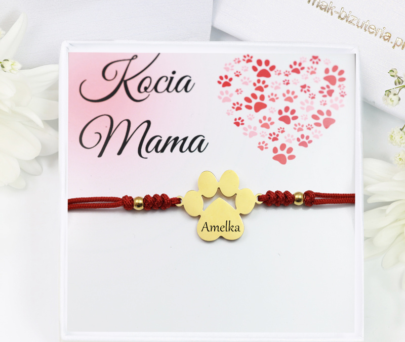 Przedmiotem oferty jest pozłacana bransoletka na sznurku z łapką, zapakowana w eleganckie pudełko z kolorową etykietą. Idealny prezent dla wielbicielek kotków.
