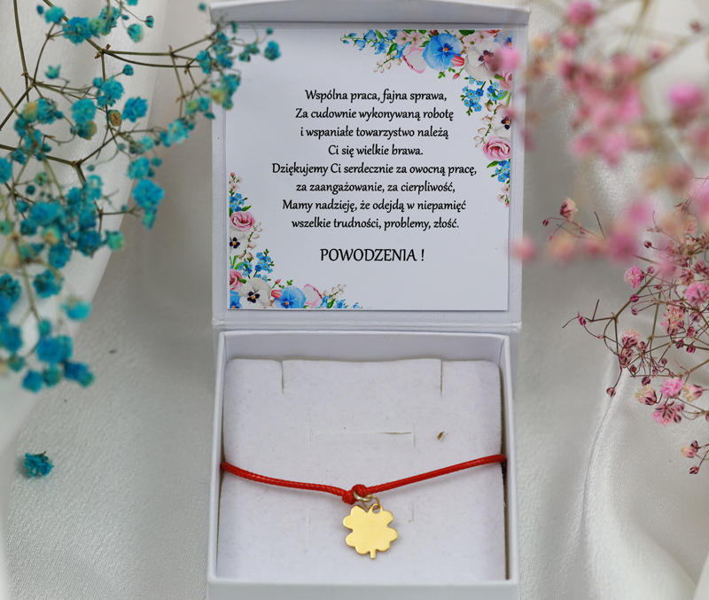 Przedmiotem oferty jest bransoletka na sznureczku z pozłacaną koniczynką.