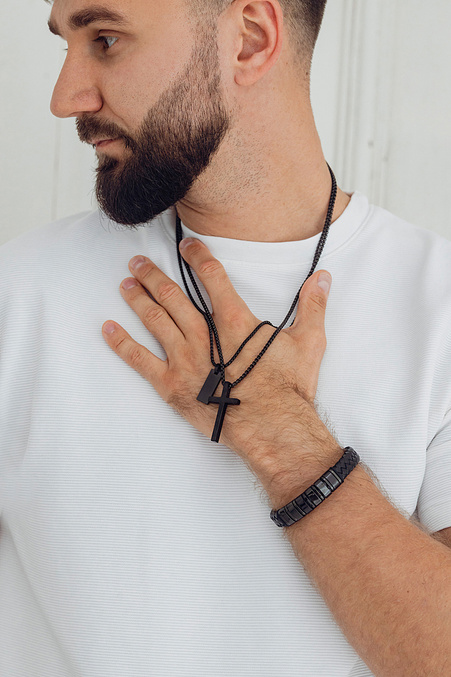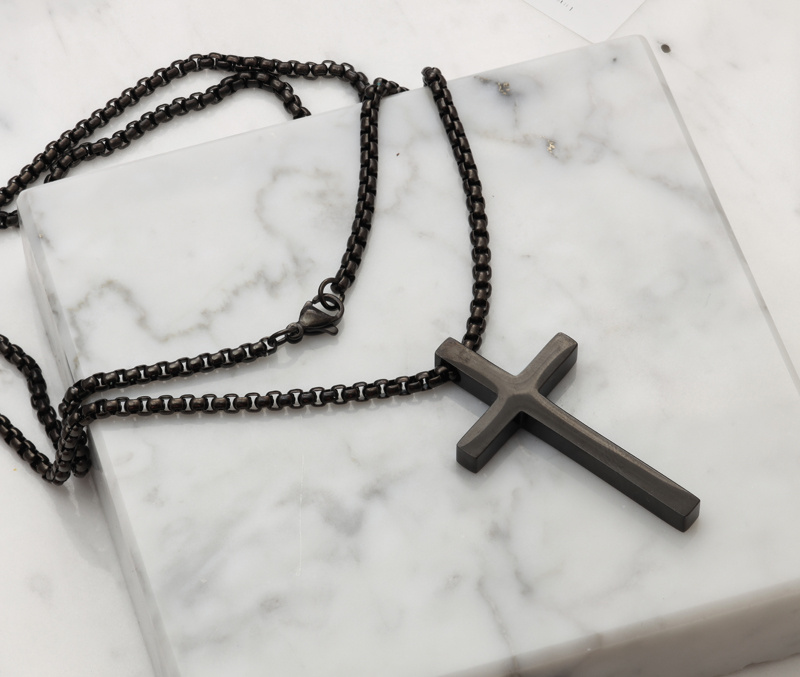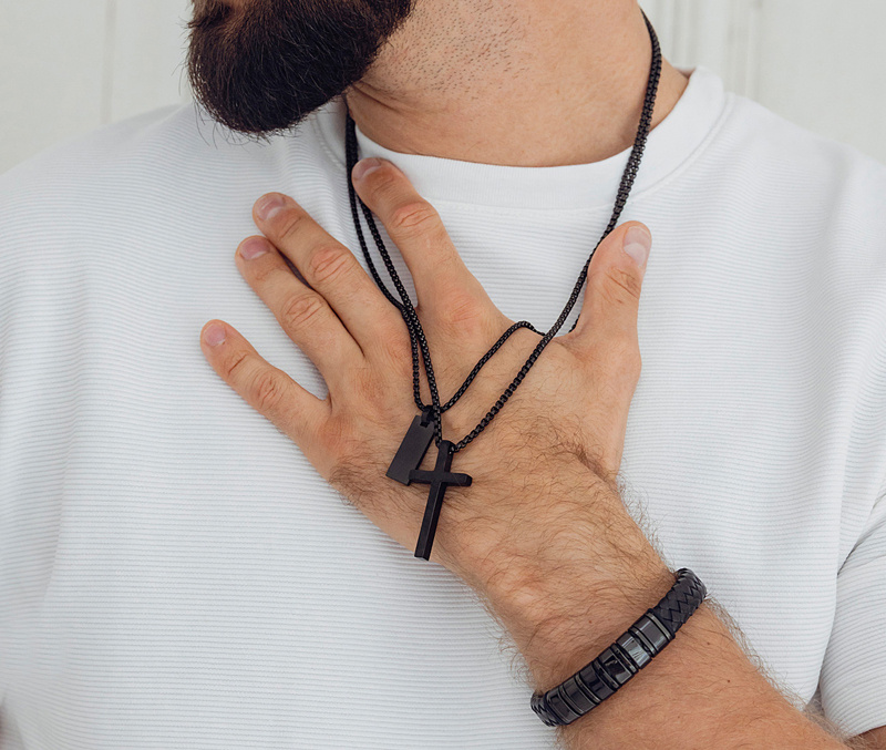 Nieśmiertelnik czarny stalowy łańcuszek z krzyżem 1864/2