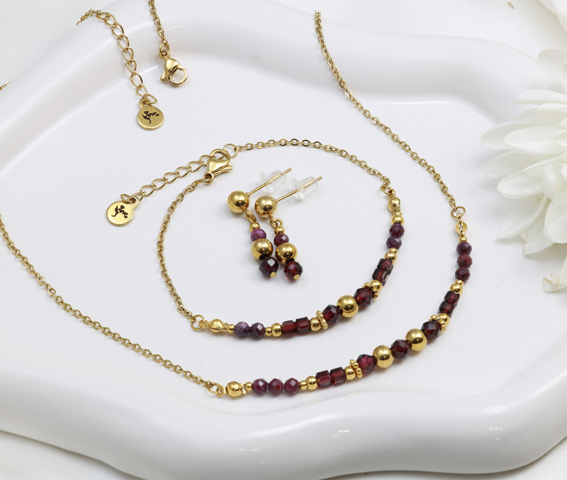 Odkryj wyjątkowe komplety biżuterii, stworzone z połączenia naturalnych kamieni oraz stali szlachetnej najwyższej jakości. Każdy zestaw składa się z naszyjnika, bransoletki i kolczyków, tworząc harmonijną całość idealną na co dzień i na specjalne okazje.