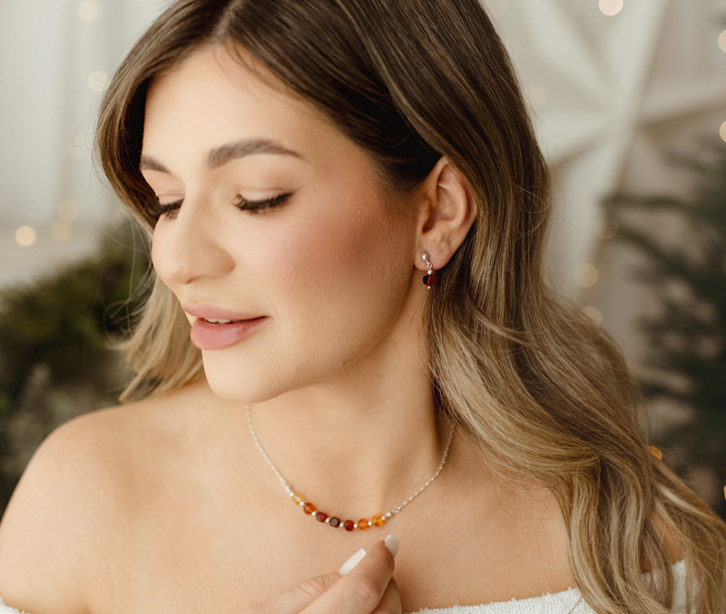 Odkryj wyjątkowy komplet biżuterii wykonany ze srebra próby 925, ozdobiony naturalnym bursztynem bałtyckim w kształcie nieregularnych kosteczek. To połączenie klasycznej elegancji z ciepłem natury, które nigdy nie wychodzi z mody.
