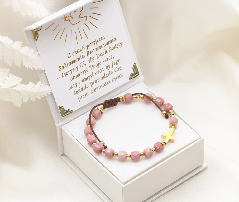 Całość uzupełniają złote koraliki ze stali szlachetnej, odpornej na zarysowania i matowienie. Centralnym elementem jest minimalistyczny, złoty krzyżyk, który podkreśla symboliczny, duchowy wymiar bransoletki, jednocześnie zachowując nowoczesny styl. Regulowane, brązowe zapięcie makramowe zapewnia wygodne dopasowanie do nadgarstka.